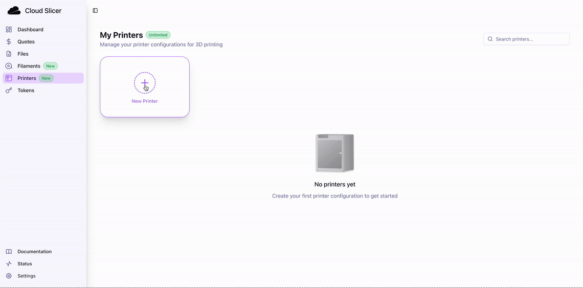 +icon in the top right corner - Configure your printer settings to match what you currently have in your local slicer application